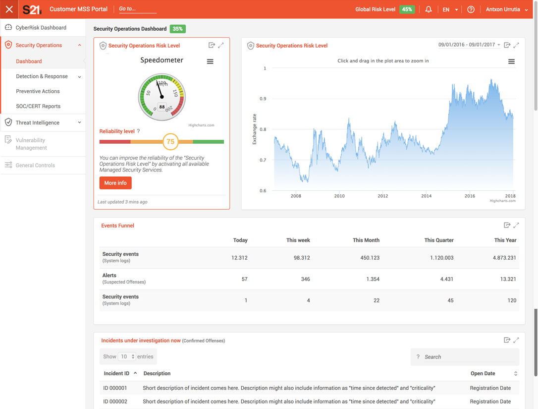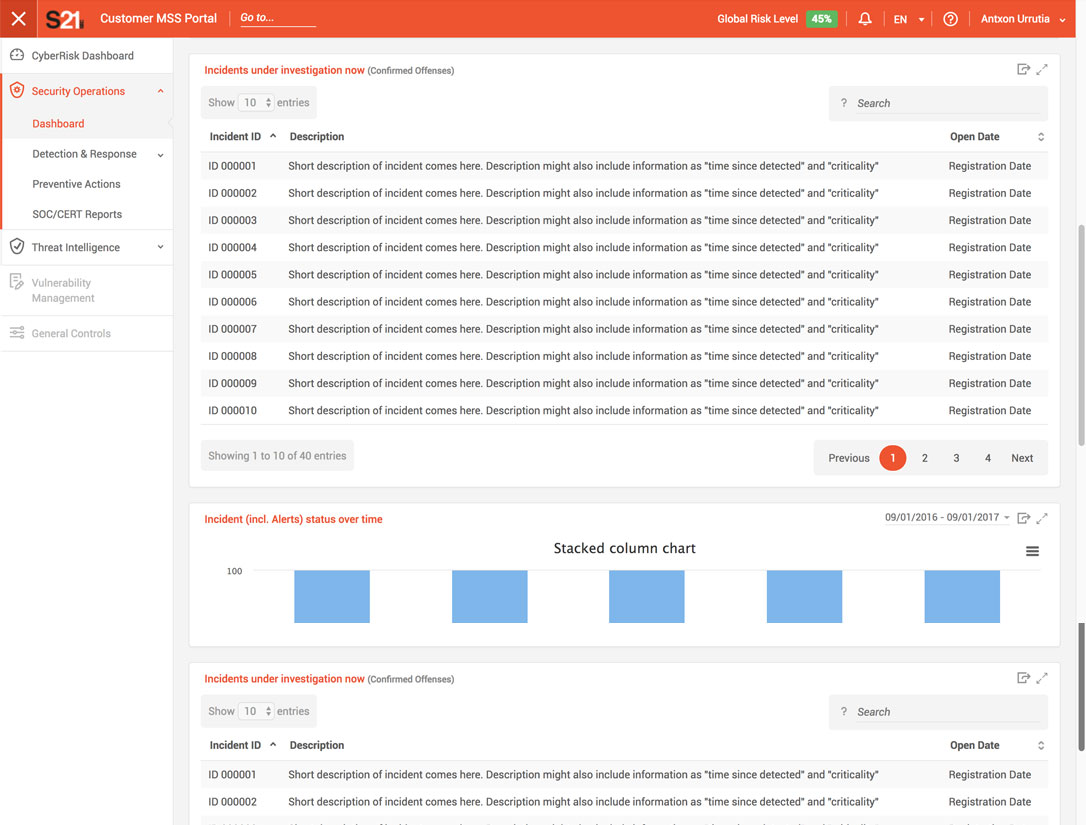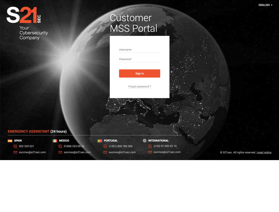 Maquetado varias plantillas [4] el interfaz (front-end) del usuario, siguiendo diseños correspondientes para un portal para clientes de S21sec.